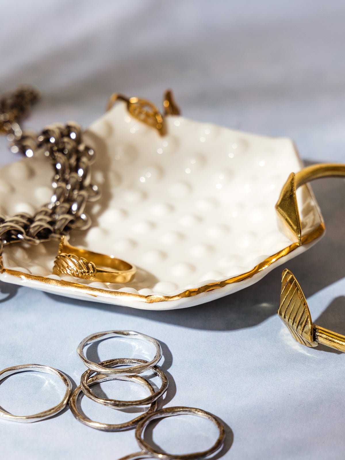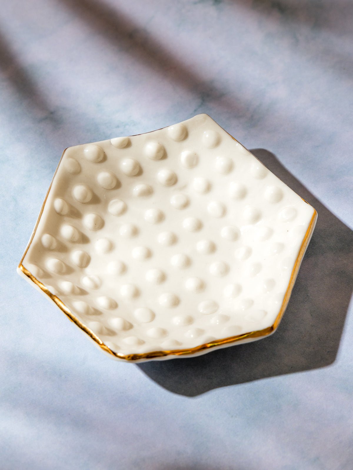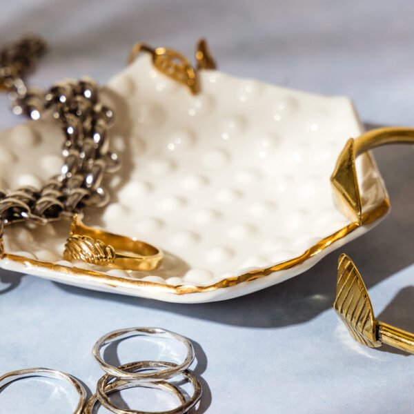 Elegant and thoughtfully designed. the Hexagon Jewelry Dish is a stunning blend of artistry and function. Crafted from porcelain bone china. this hexagon-shaped dish features delicate raised dot detailing and is finished with a kiln-fired 22K gold luster trim. Perfect for holding rings. small jewelry. or everyday catch-alls. it brings both beauty and organization to your space.